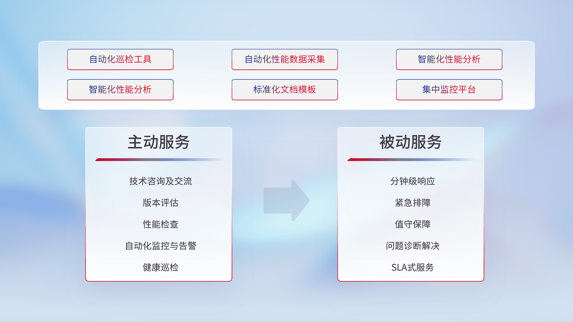 智能化工具和标准化文档,,,,保障服务质量,,,提供主动服务(包含技术咨询、、版本评估、、、、性能检查、、、、自动化监控与告警、、、健康巡检)和被动服务包含(分钟级响应、、紧急排障、、、、值守保障、、问题诊断解决、、SLA服务)。。。